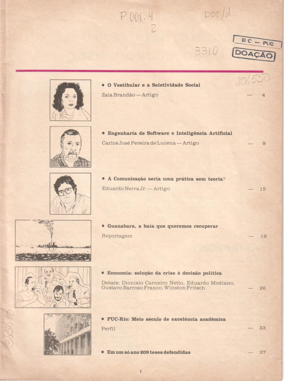 Índice da edição de Julho, Agosto e Setembro da Revista PUC CIÊNCIA com gravuras de alguns professores e seus respectivos artigos.