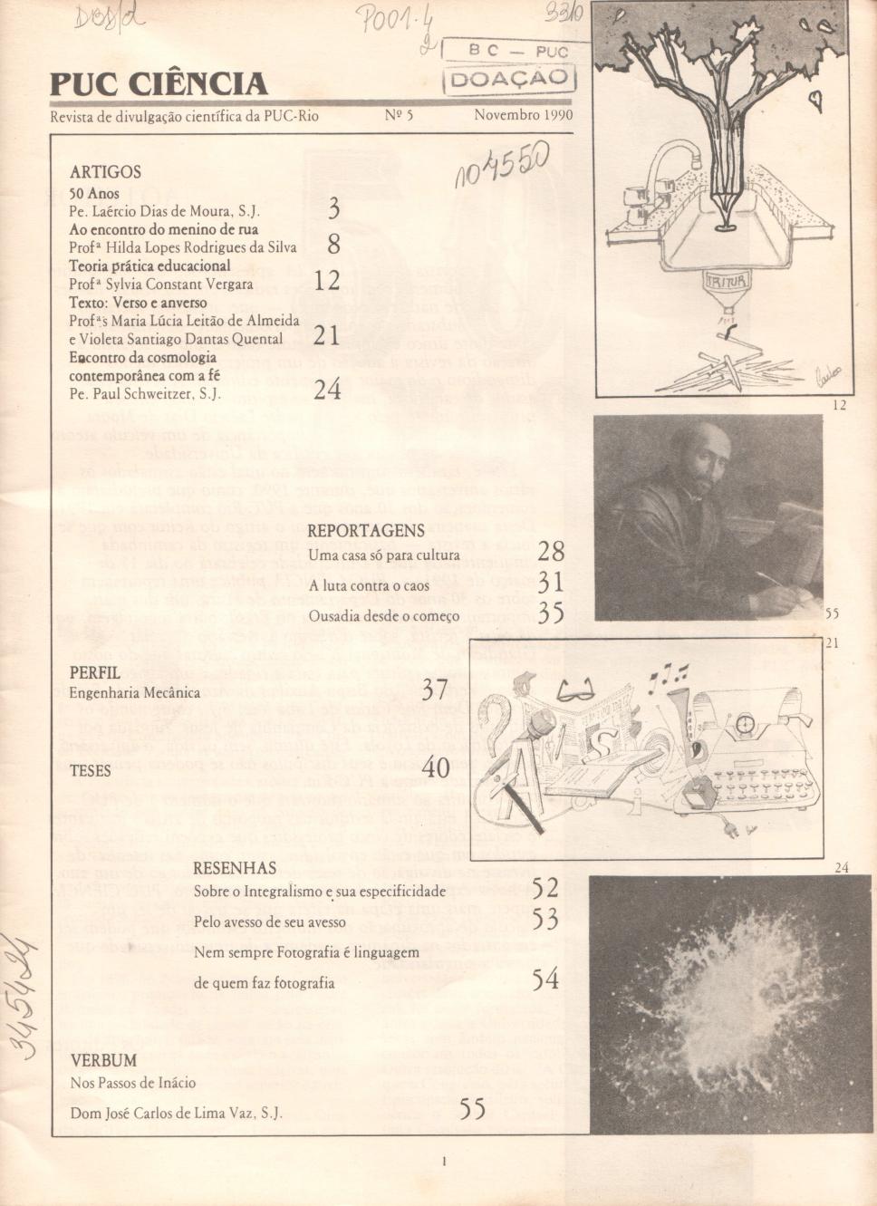 Índice da quinta edição da revista PUC CIÈNCIA com a lista de artigos, reportagens e resenhas e algumas gravuras.
