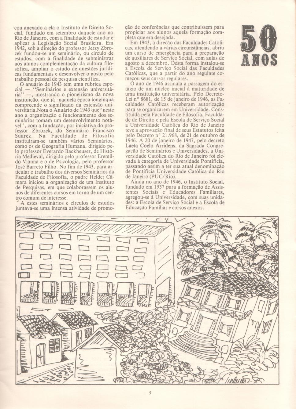 Continuação do artigo da quinta edição da revista PUC CIÊNCIA número cinco sobre os cinquenta anos de existencia da PUC-Rio, contando sua trajetória e o contexto que a precedeu e na qual foi fundada,nesta página uma gravura do campus Gávea.