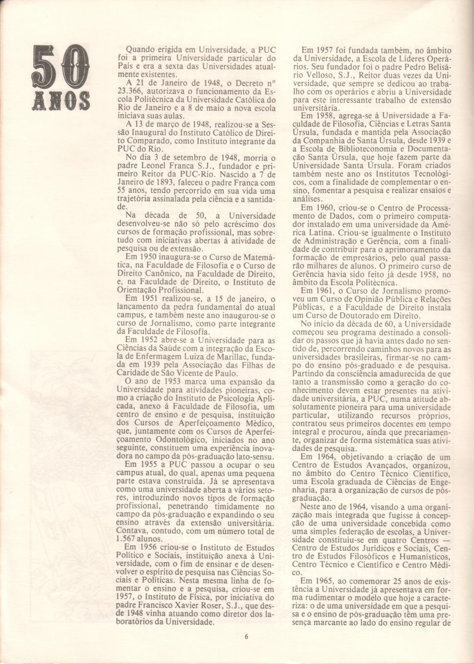 Continuação do artigo da quinta edição da revista PUC CIÊNCIA número cinco, sobre os cinquenta anos de existencia da PUC-Rio, contando sua trajetória e o contexto que a precedeu e na qual foi fundada.
