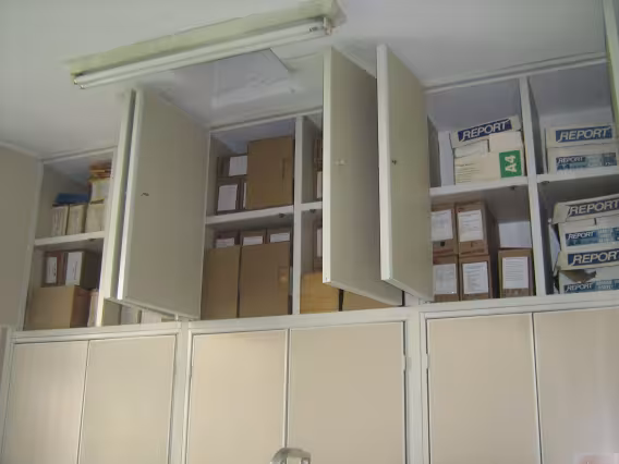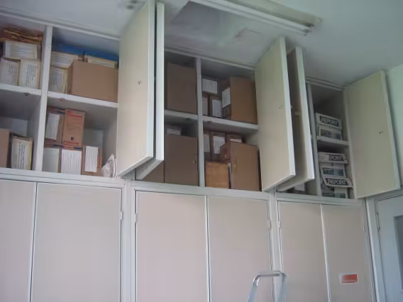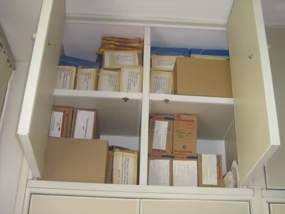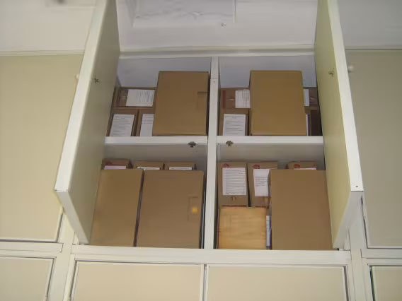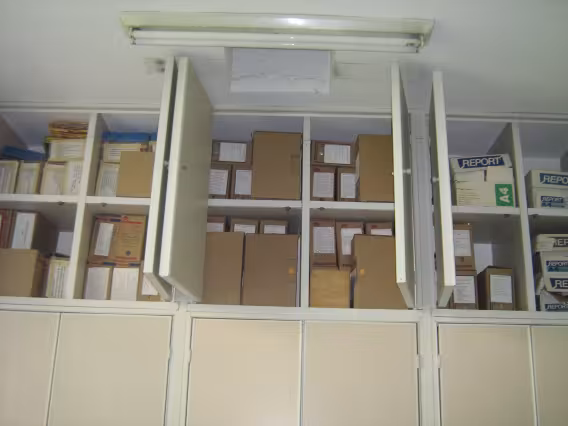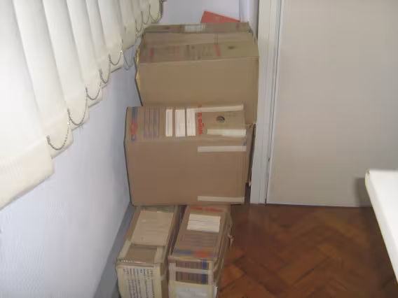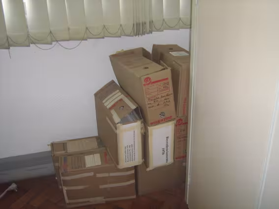 Fotos do Departamento de Educação, sala L507 contendo armários com caixas com documentos, fichas de alunos, relatórios, ofícios, correspondências internas e externas, atas de reuniões, notas fiscais e relações de bolsistas do Mestrado e Doutorado.