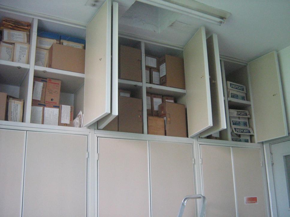 Foto das seis portas do armário, com as caixas contendo os arquivos do departamento.