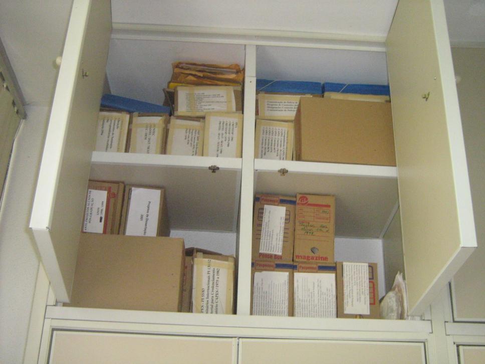 Foto das portas 1 e 2 do armário, com as caixas contendo os arquivos do departamento.