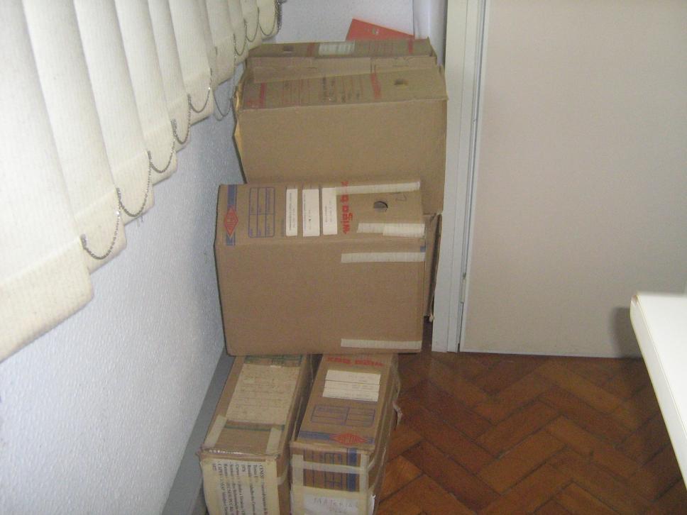 Fotos das caixas que contêm documentos que ficam no chão ao lado do armário.
