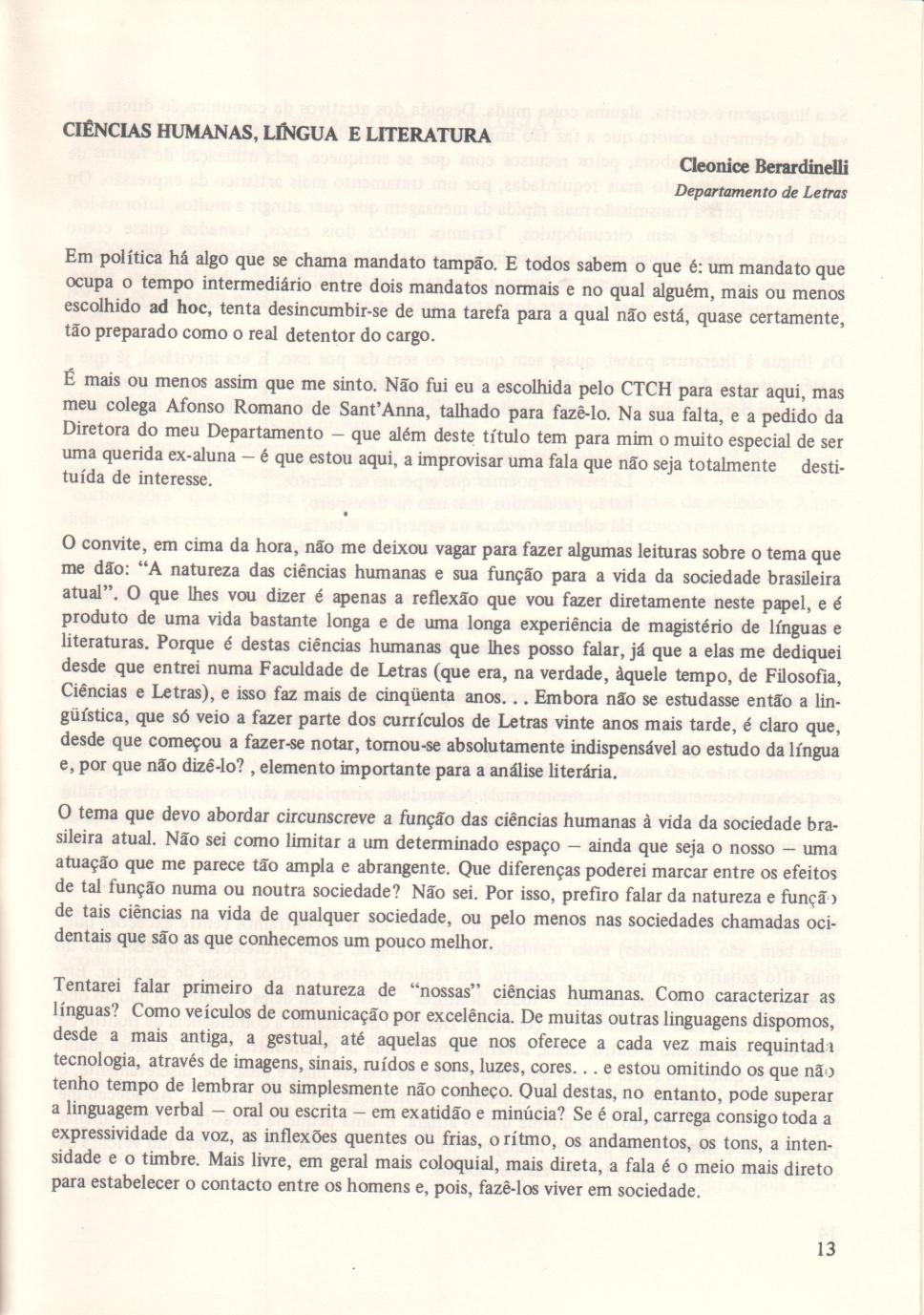 Texto com a fala da professora Cleonice Berardinelli do Departamento de Letras, substituindo o professor Afonso Romano de Sant'Anna que não pôde comparecer.