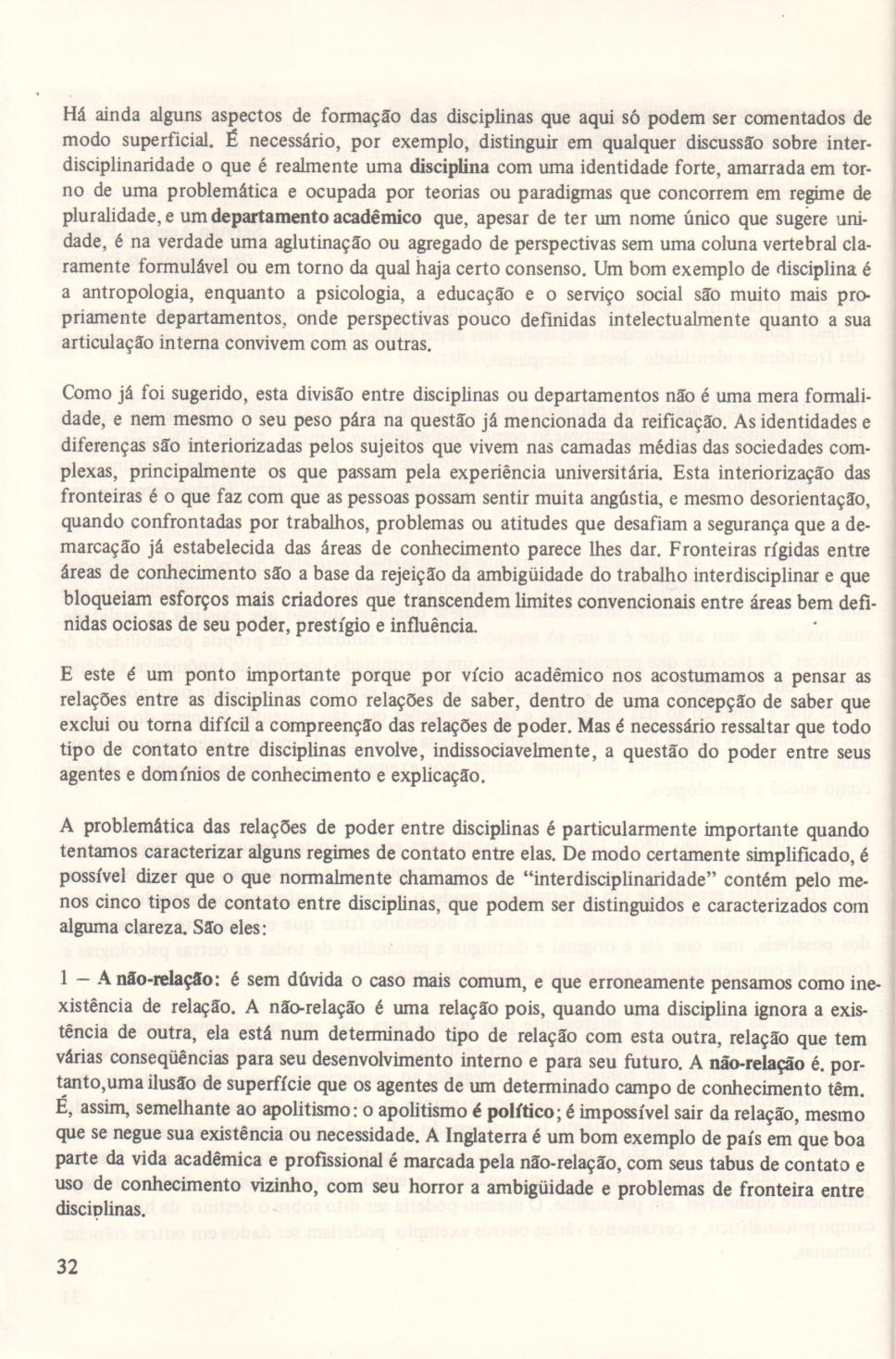 Continuação do texto do professor Sérvulo Augusto Figueira do Departamento de Psicologia sobre a interdisciplinalidade das ciências humanas. O autor faz um diferenciação entre disciplinas e departamentos, onde, antropologia é apresentada como disciplina e educação, serviço social e psicologia como departamentos. O professor classifica ainda cinco tipos de contatos entre as disciplinas, nesta página o primeiro deles.