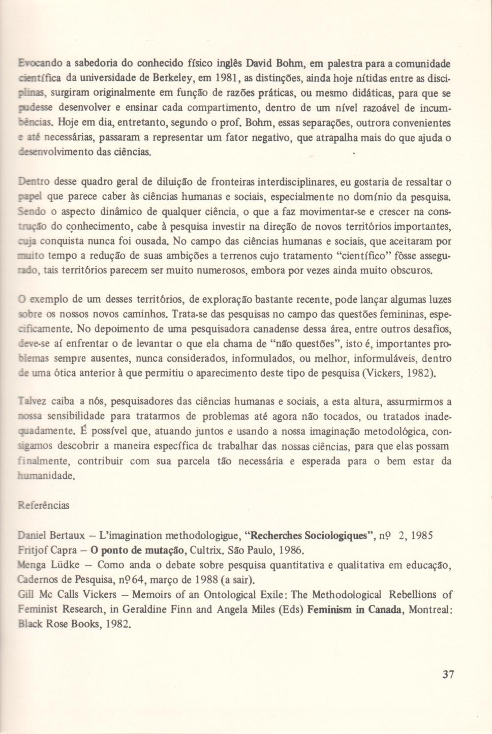 Continuação do texto da professora Menga Lüdke (EDU) no Simpósio do CTCH sobre a Metodologia de Pesquisa, disciplina lecionada pela professora em cursos de pós-graduação em educação.