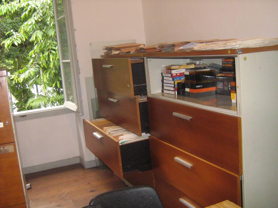Gavetas contendo documentos do Solar, fitas VHS, fitas-cassete e outras pastas de documentos.