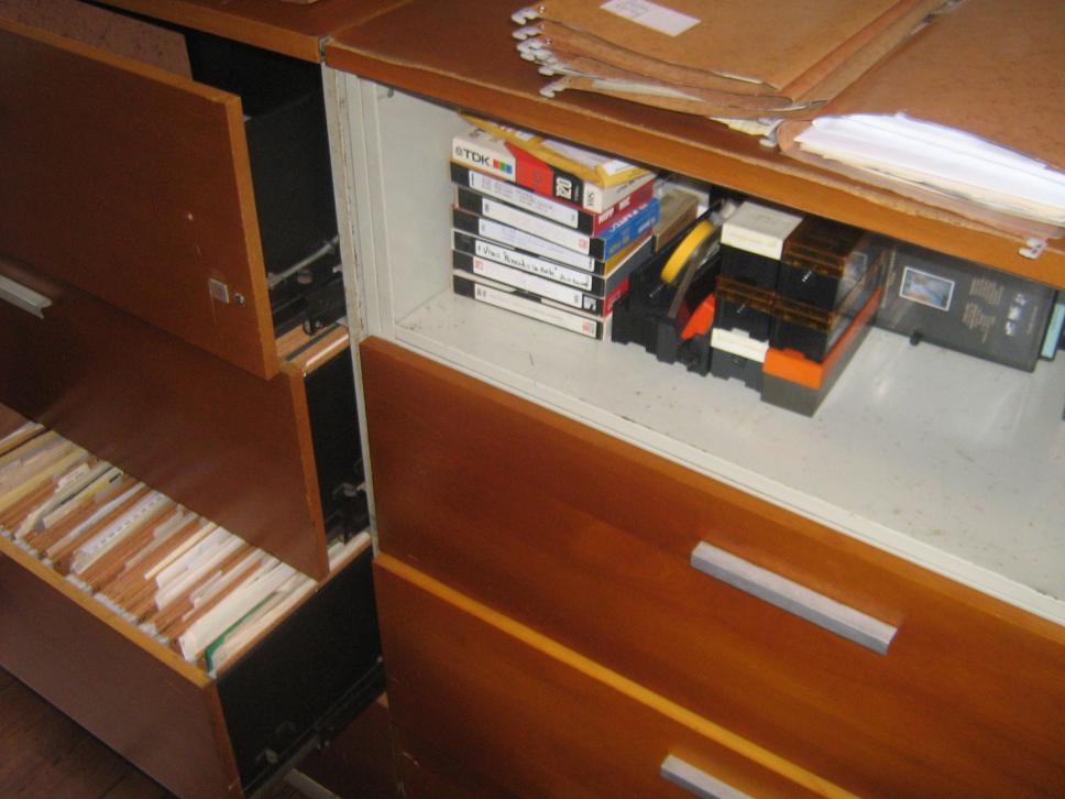 Gavetas com fitas VHS, fitas-cassete e slides no acervo do Solar Grandjean de Montigny