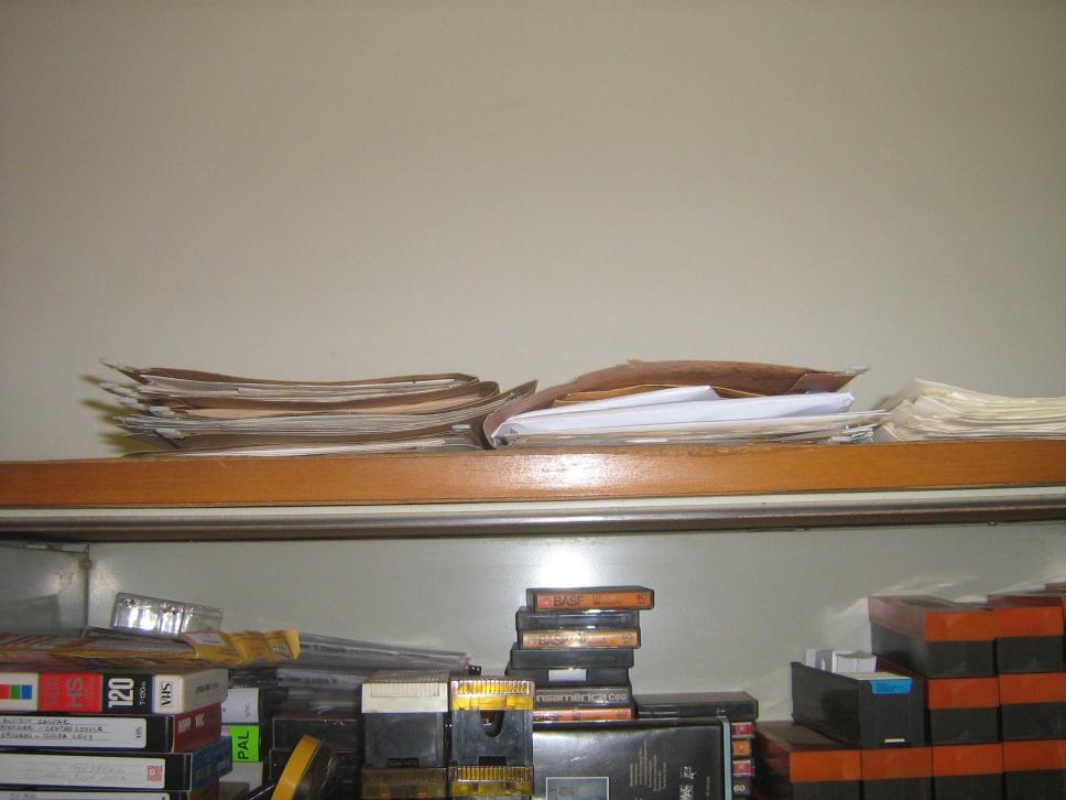 Bancadas com fitas VHS, fitas-cassete e slides no acervo do Solar Grandjean de Montigny