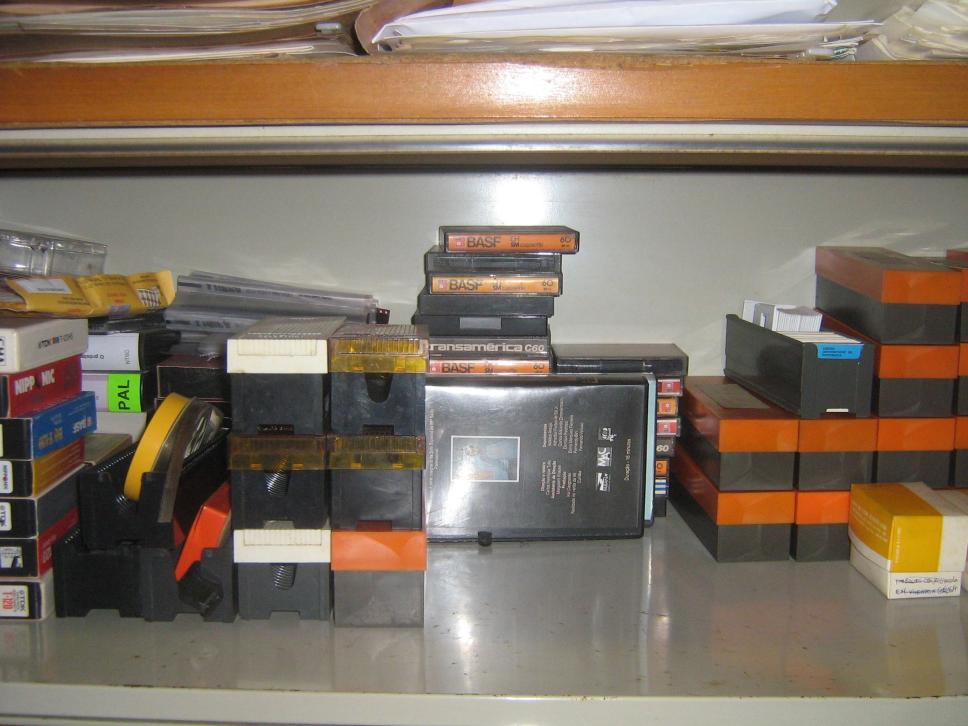 Bancadas com fitas VHS, fitas-cassete e slides no acervo do Solar Grandjean de Montigny.
