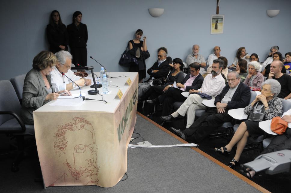 Da esq. para a dir. na mesa principal: Nathália Timberg e Othon Bastos (TV Globo). Na platéia, prof. Domício Proença Filho (UFRJ); Sílvia Fiúza
