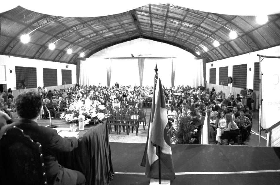 Formatura de uma turma de Administração do programa de Pós-Graduação, ginásio, autoridades, microfone, solenidade, bandeira do Brasil, alunos, cadeira