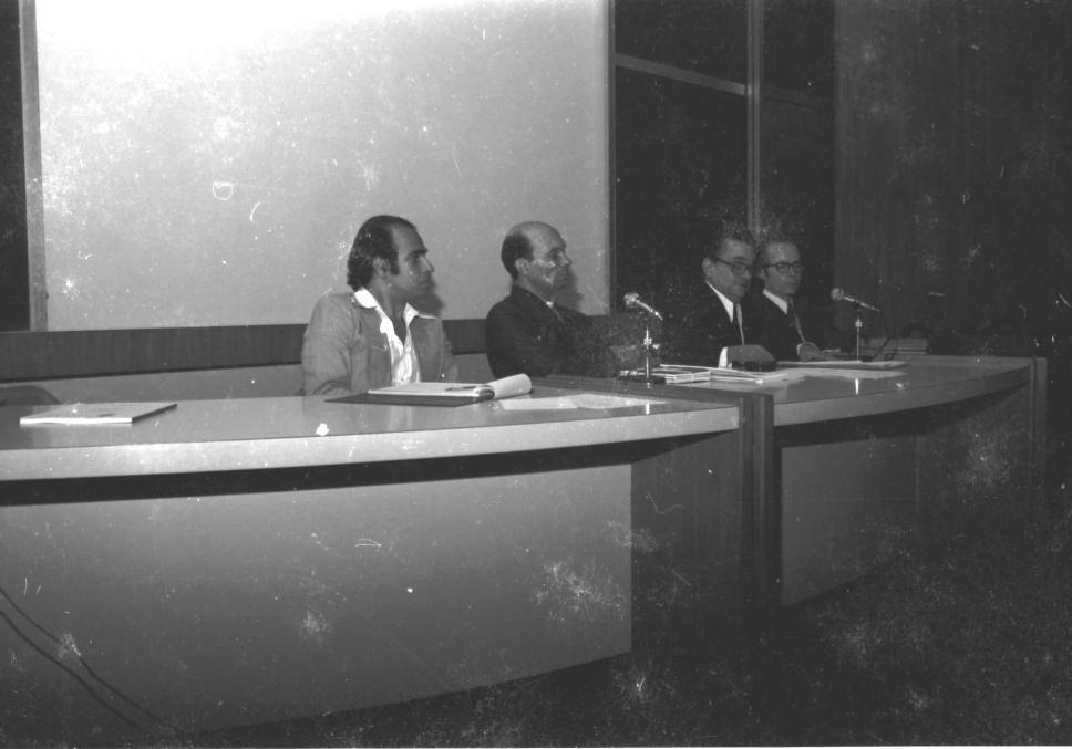 Mesa com palestrantes. Talvez seja a mesa de abertura, pela presença do Reitor.