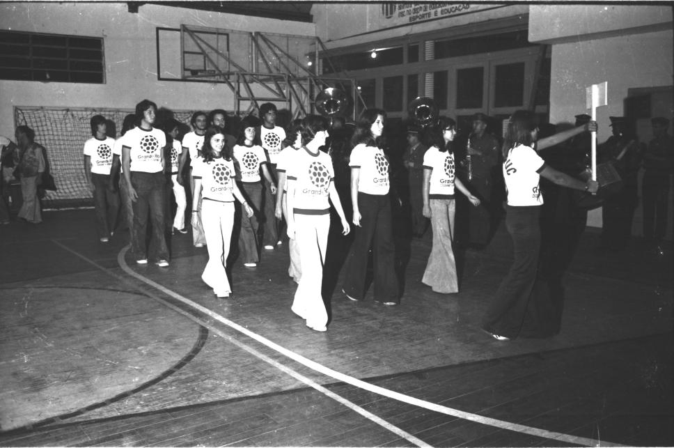 Cerimônia de abertura da I Olimpíada Interna da ENGEPUC. Participaram alunos, funcionários e professores. Camisetas e bandeiras da caderneta de poupança Grande Rio. Banda de música,