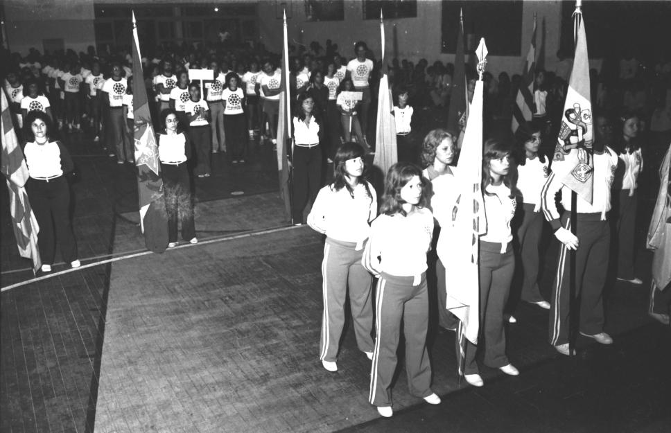 Cerimônia de abertura da I Olimpíada Interna da ENGEPUC. Participaram alunos, funcionários e professores. Camisetas e bandeiras da caderneta de poupança Grande Rio.