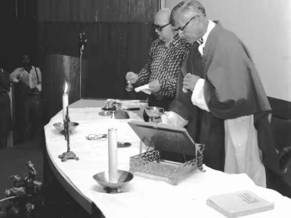 ls0027_002 | 9/3/1976 | O Grão-Chanceler Dom Eugênio Salles oferece hóstia consagrada na Missa do Espírito Santo realizada na abertura do ano letivo de 1976. |