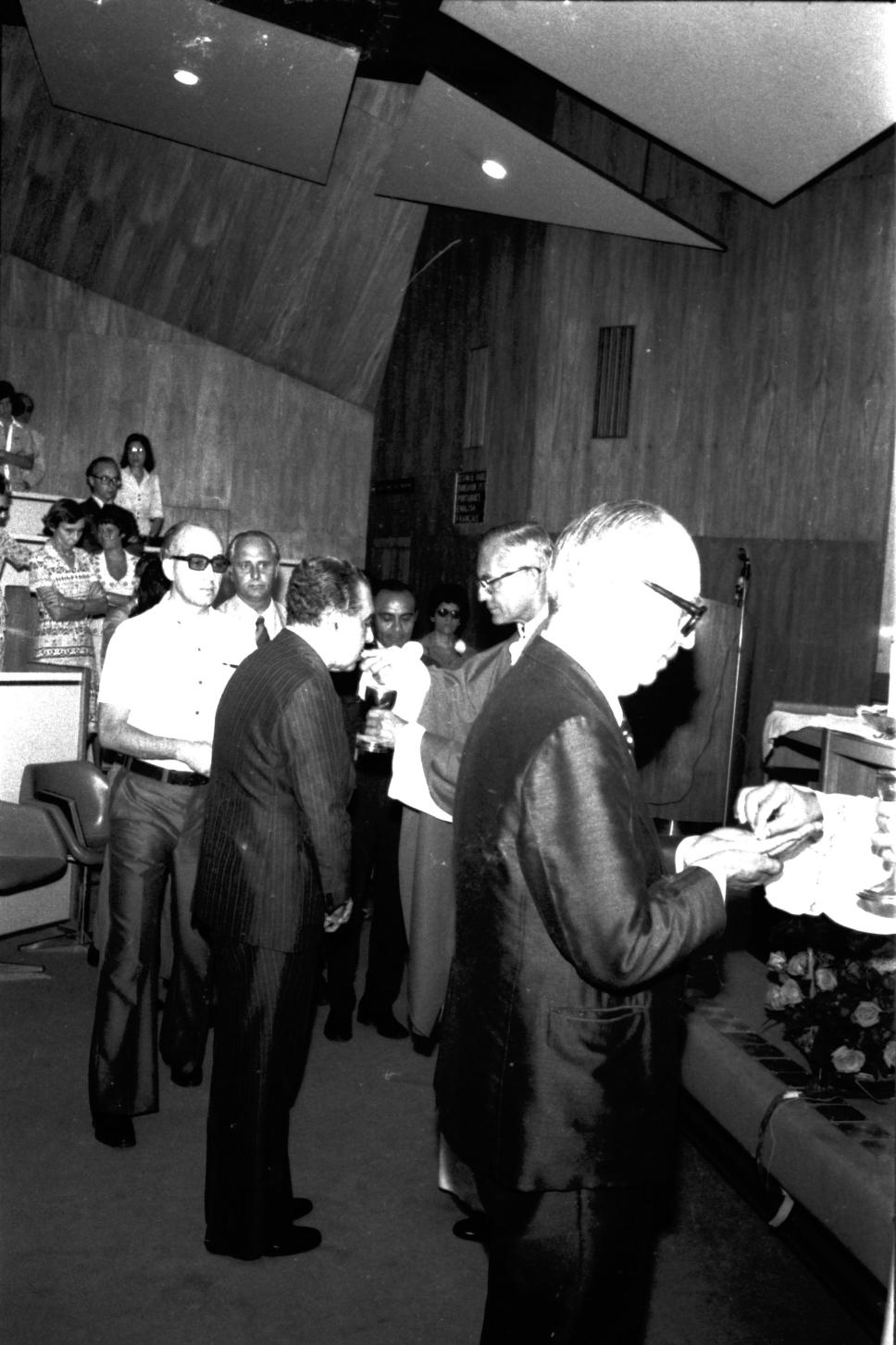 O Grão-Chanceler Dom Eugênio Salles oferece hóstia consagrada na Missa do Espírito Santo realizada na abertura do ano letivo de 1976.
