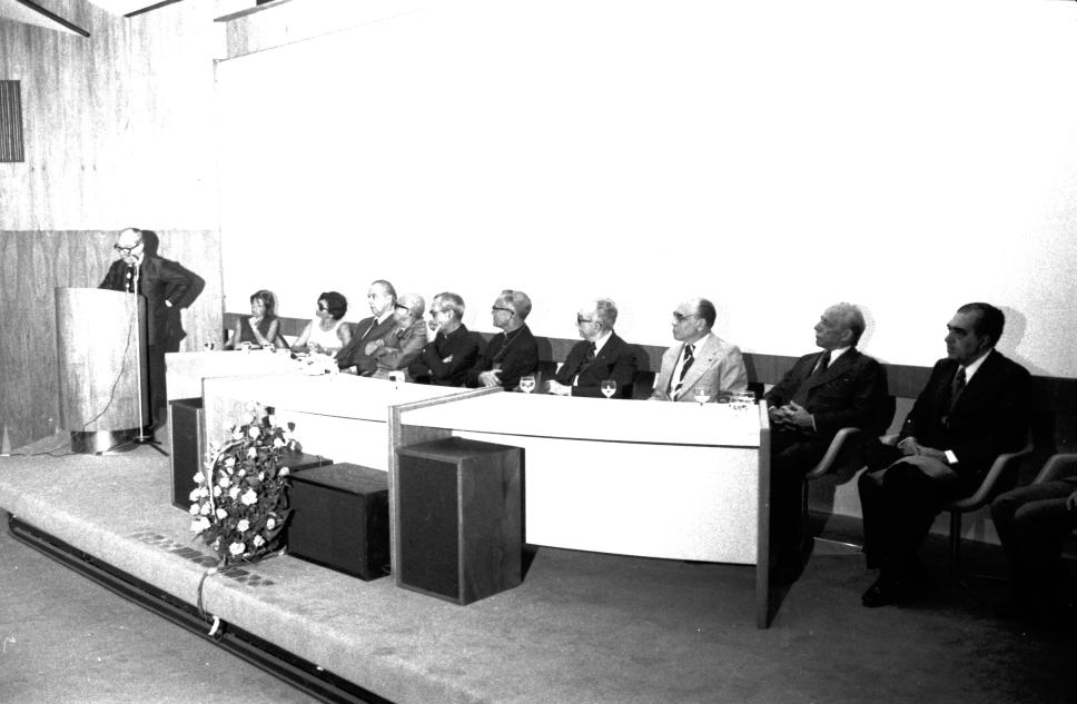 Na mesa da esq. para dir.: 1º - no atril: o prof. Américo Jacobina Lacombe (HIS); 4º - prof. Galeno Martins de Almeida (JUR); 5º - prof. pe. Fernando Bastos de Ávila S.J. (IEPS); 6º - pe. Pedro Belisário Velloso Rebello S.J. (Reitor); 7º - dom Eugênio de Araújo Sales (cardeal, arcebispo).