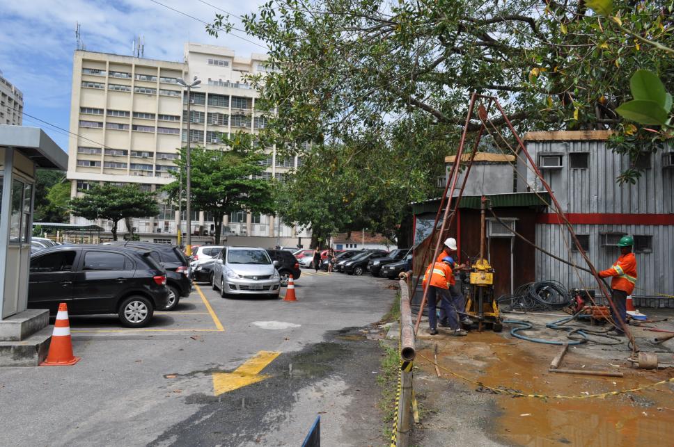 Operários durante a sondagem do solo para as obras da futura estação do metrô da Gávea. Ao fundo, a Ala Frings.