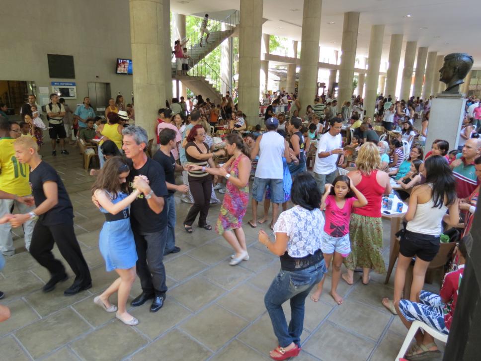 Funcionários dançam na festa.