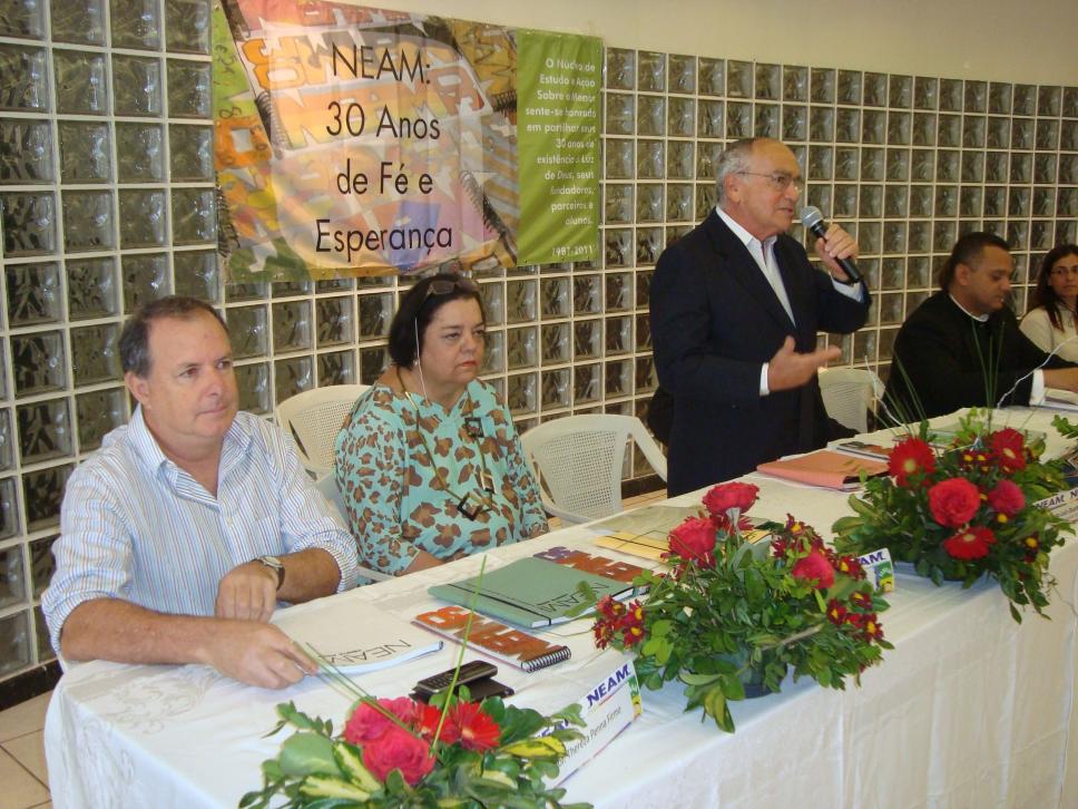 Da esq. para dir.: Floriano Saad Mazini (Superintendência Administrativa), profa. Marina Moreira (NEAM), prof. Augusto Sampaio (Vice-Reitor para Assuntos Comunitários)