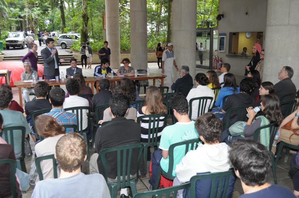 Na mesa da esq. para dir.: Prof. Álvaro Caldas (COM), Robson Leite (Deputado Estadual), Wadih Damous (Presidente da OAB) e Ana Bursztyn-Miranda (Coletivo RJ Memória).