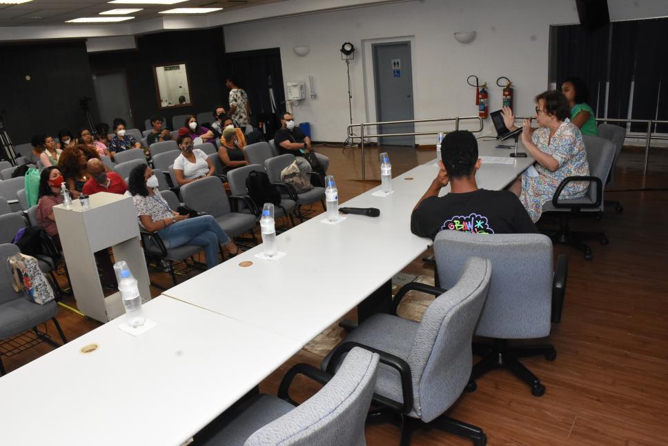 Na mesa da esquerda para direita: Felipe N. Belo, profa. Andreia Clapp Salvador (SER), Juliana Márcia Santos Silva