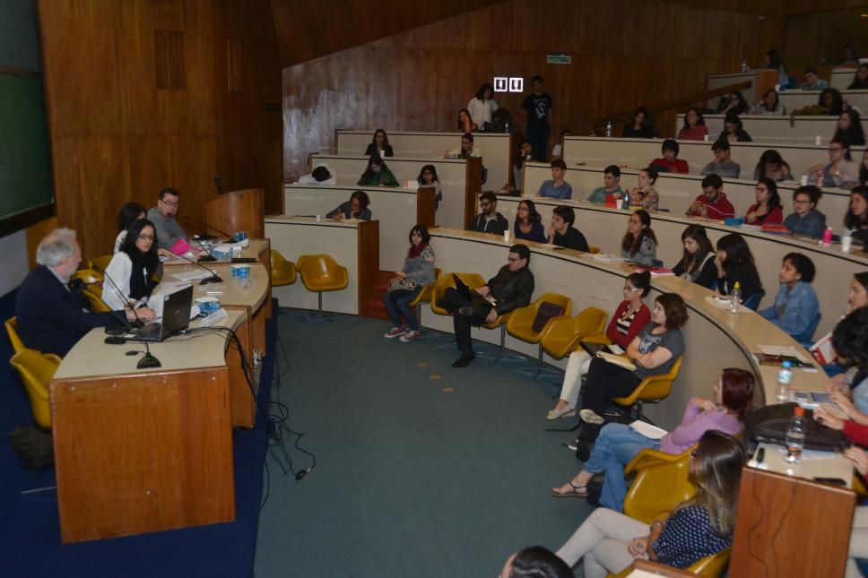 Mesa com palestrantes e plateia do painel 1: Experiências Masculinas e de Crianças em Situação de Conflito.
