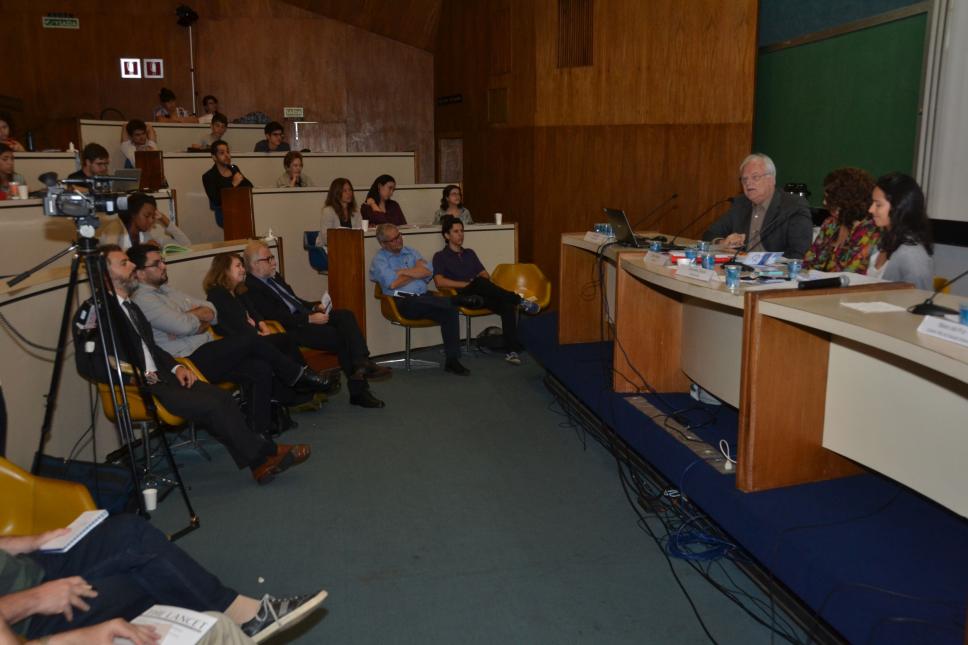 Na mesa da esquerda para direita: Paulo Buss (CRIS/FIOCRUZ), Deisy Ventura (IRI/USP), profa. Geovana Zoccal (IRI/PUC-Rio)