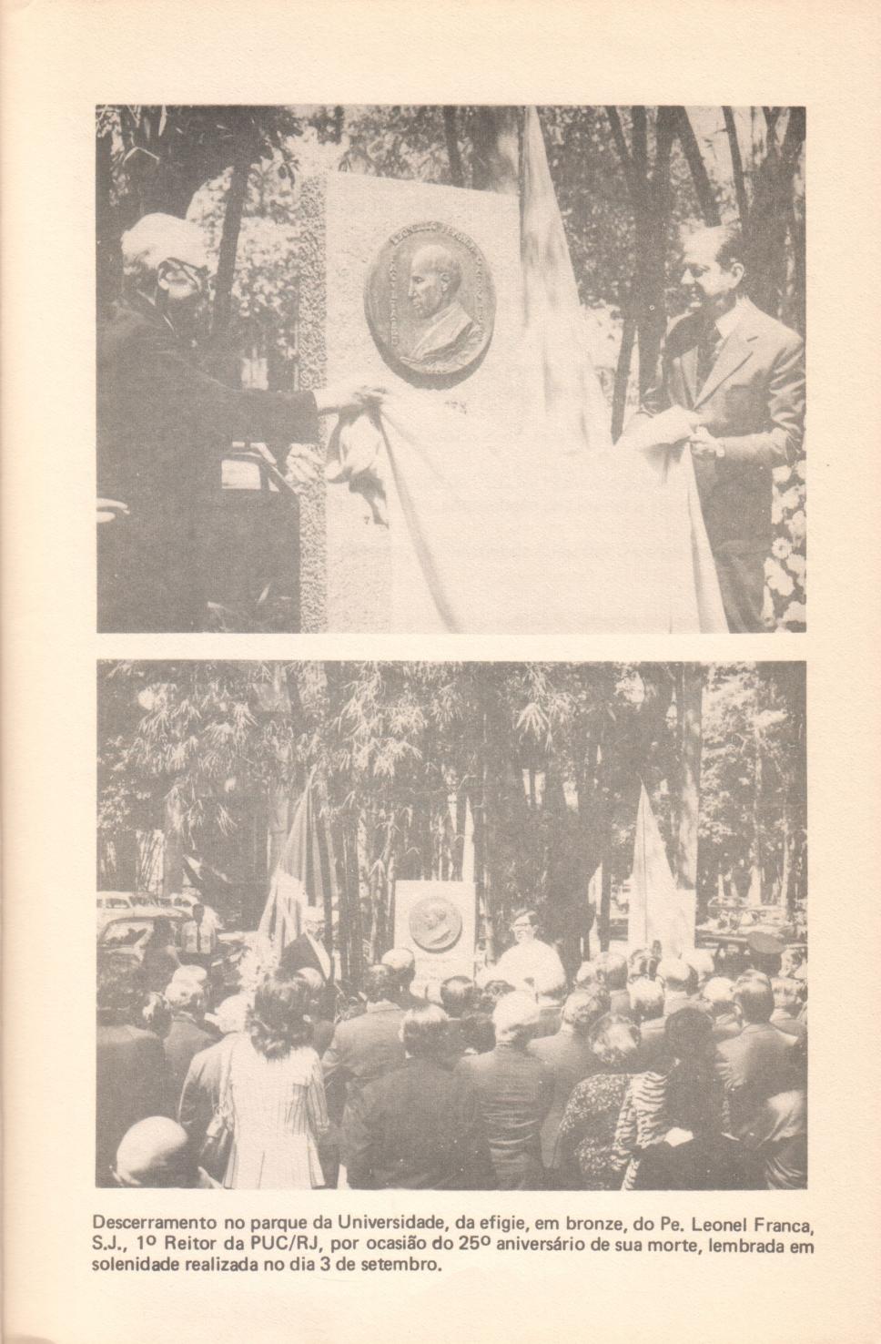 Fotos do descerramento no parque da Universidade, da efígie do Pe. Leonel Franca em celebração do 25º aniversário de sua morte. Evento realizado em 3/09/1973.