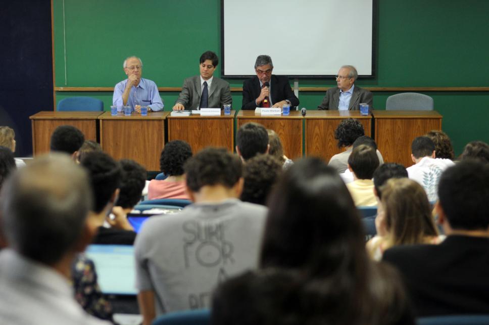 Mesa formada por professores do Departamento de Direito durante a aula magna proferida pelo jornalista Paulo Markun sobre o tema A rede da Legalidade.