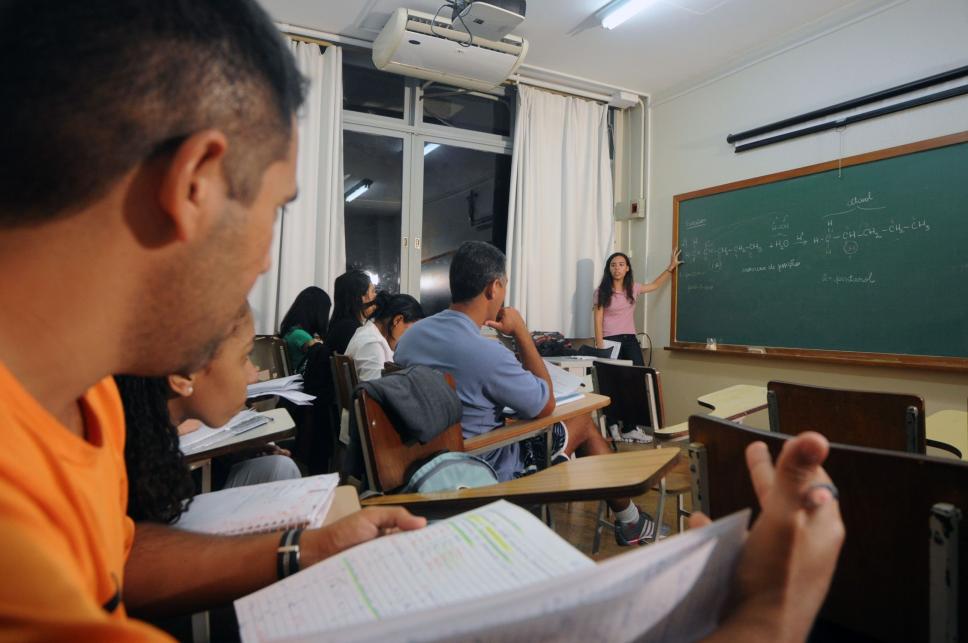 Alunos e professora voluntária do Curso pré-vestibular comunitário promovido pelo Centro de Pastoral Anchieta e destinado a funcionários da PUC-Rio.
