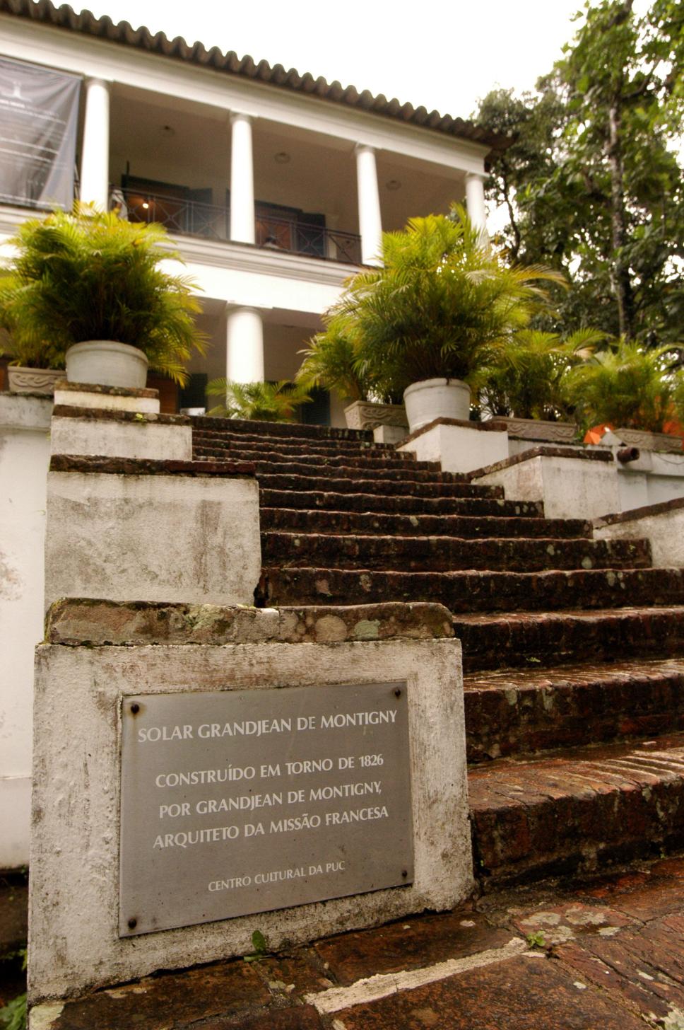 Escadaria de ingresso do Solar Grandjean de Montigny e placa de identificação de sua construção.