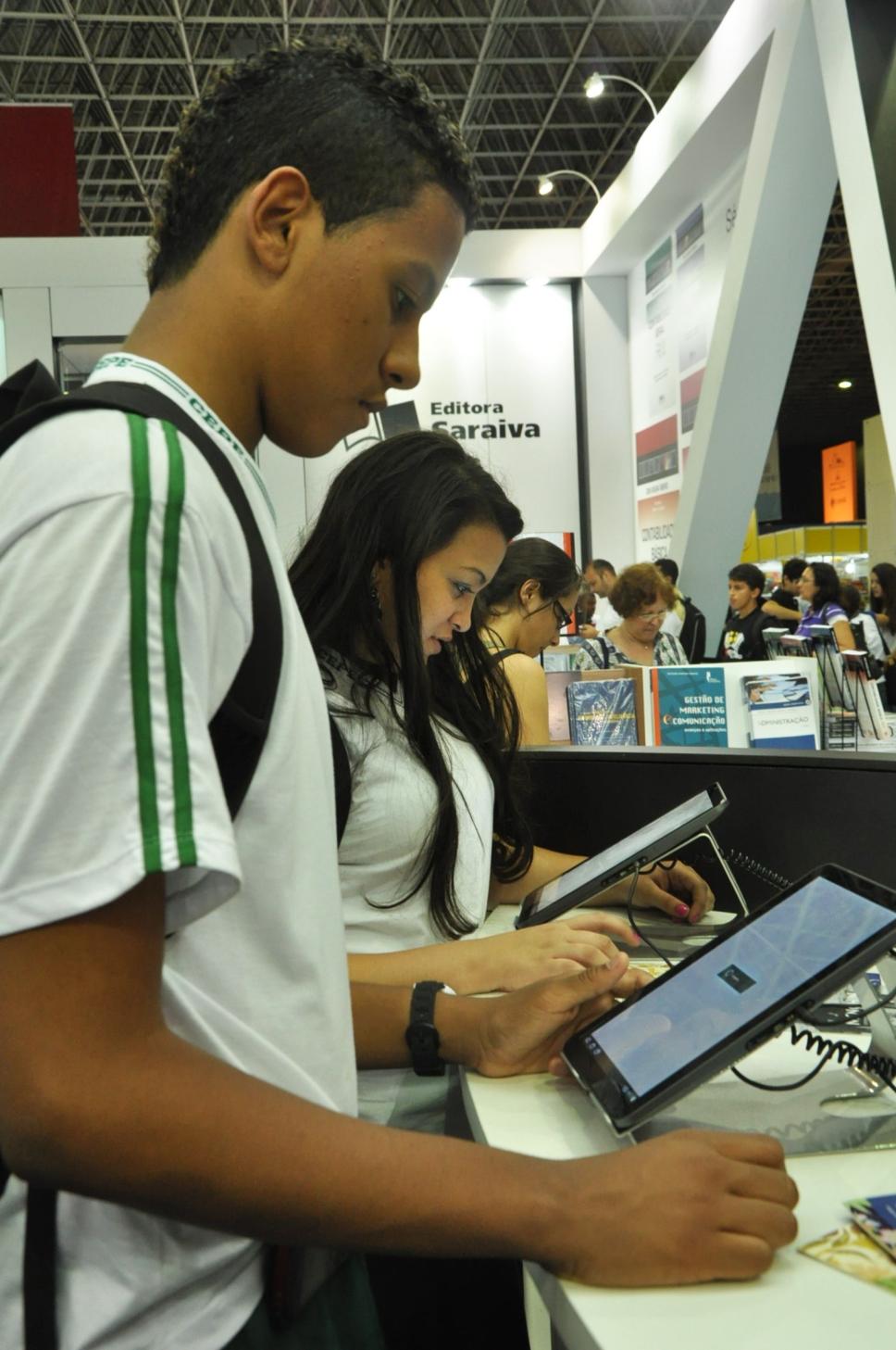 Jovens leem em tablets em um dos standas da Bienal do Livro de 2011, no Riocentro.