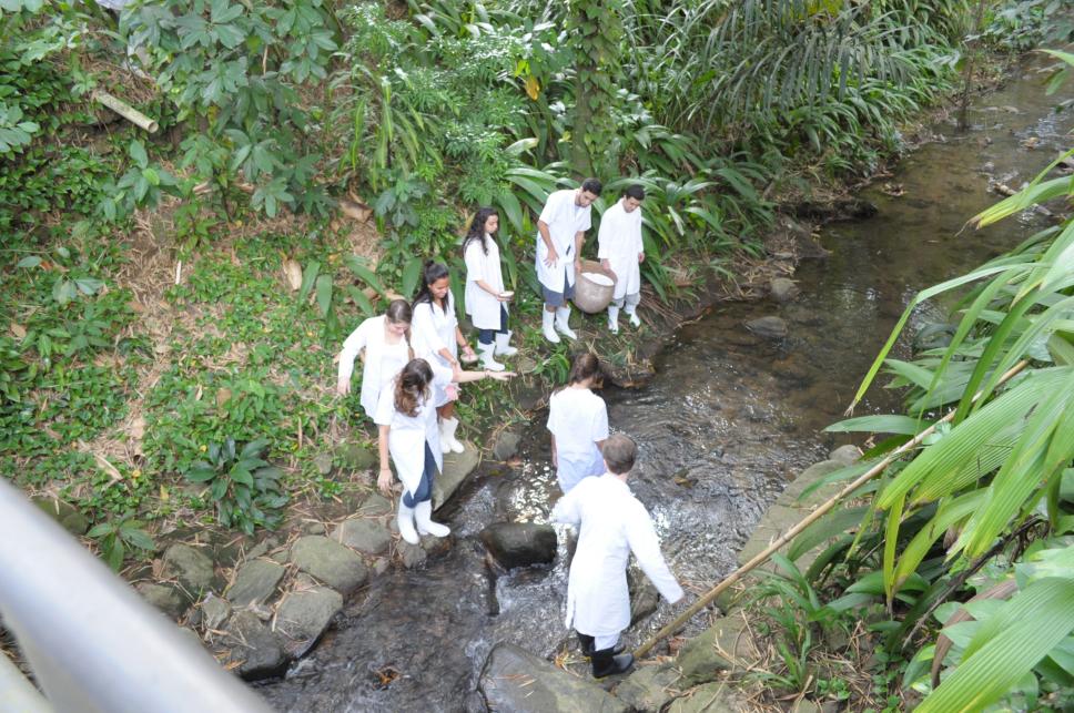 Alunos entram no rio.