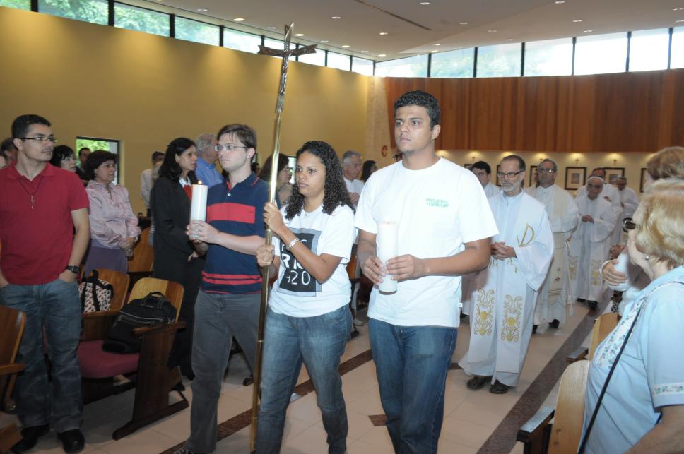 Alunos entram na igreja com velas e crucifixo na companhia dos padres.