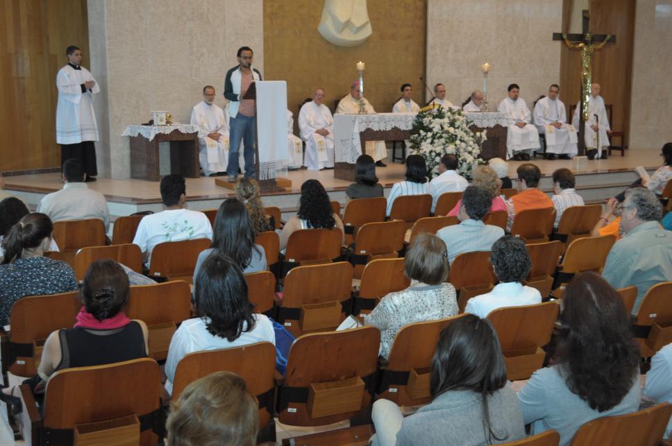 Da esq. para dir. sentados nas cadeiras do altar: 1º - prof. pe. Paul Alexander Schweitzer S.J. (MAT), 4º - prof. pe. Josafá Carlos de Siqueira S.J. (BIO, Reitor), 5º - Arcebispo Dom Orani João Tempesta, O. Cist., 8º - prof. pe. Jesús Hortal Sànchez S.J. (TEO)