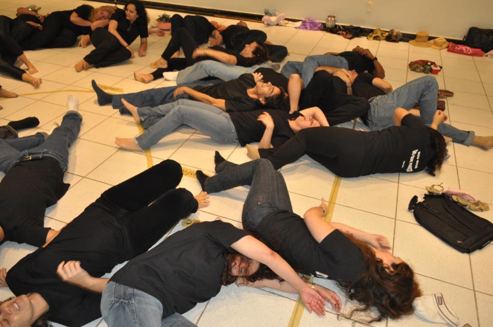 Grupo de funcionários deitados no chão realizam aquecimento em dinâmica teatral.