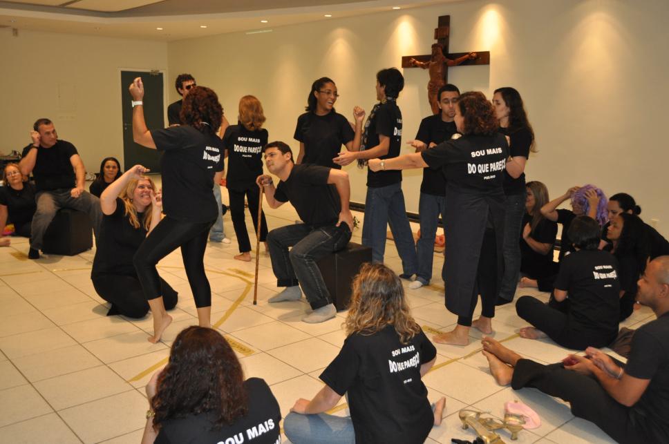 Funcionários desenvolvem personagens e encenam esquete teatral.