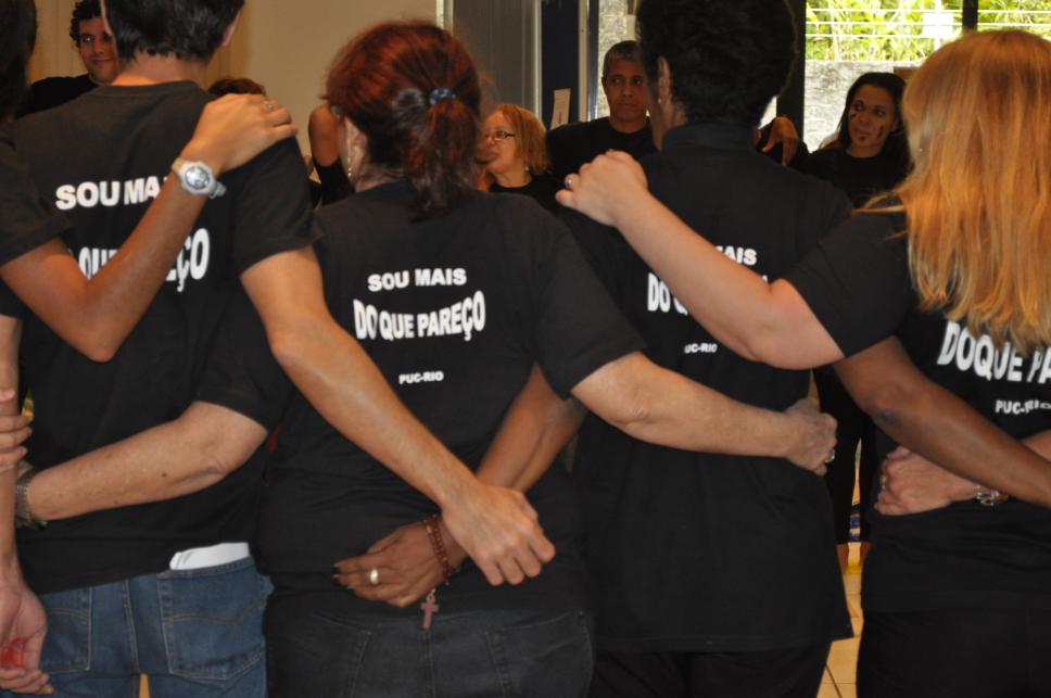 Funcionários se abraçam ao término da apresentação de teatro.