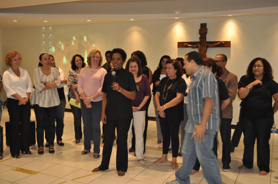 Funcionários encerram a atividade de confraternização do grupo de teatro.
