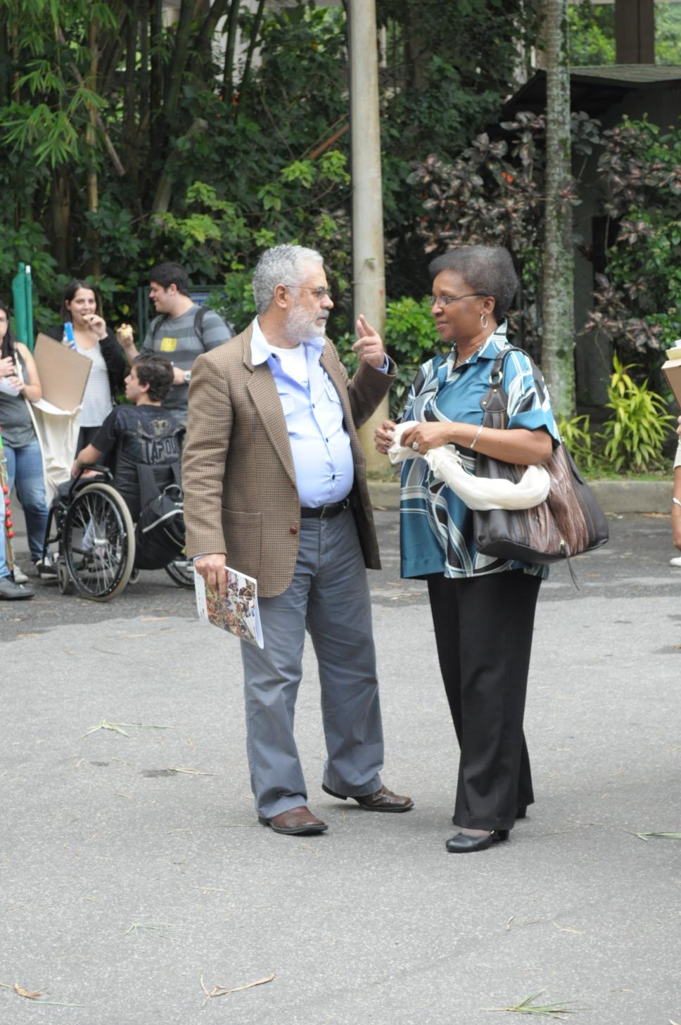 Professor Adair Rocha e Luiza Helena de Bairros (Geledés) conversam no início do evento.