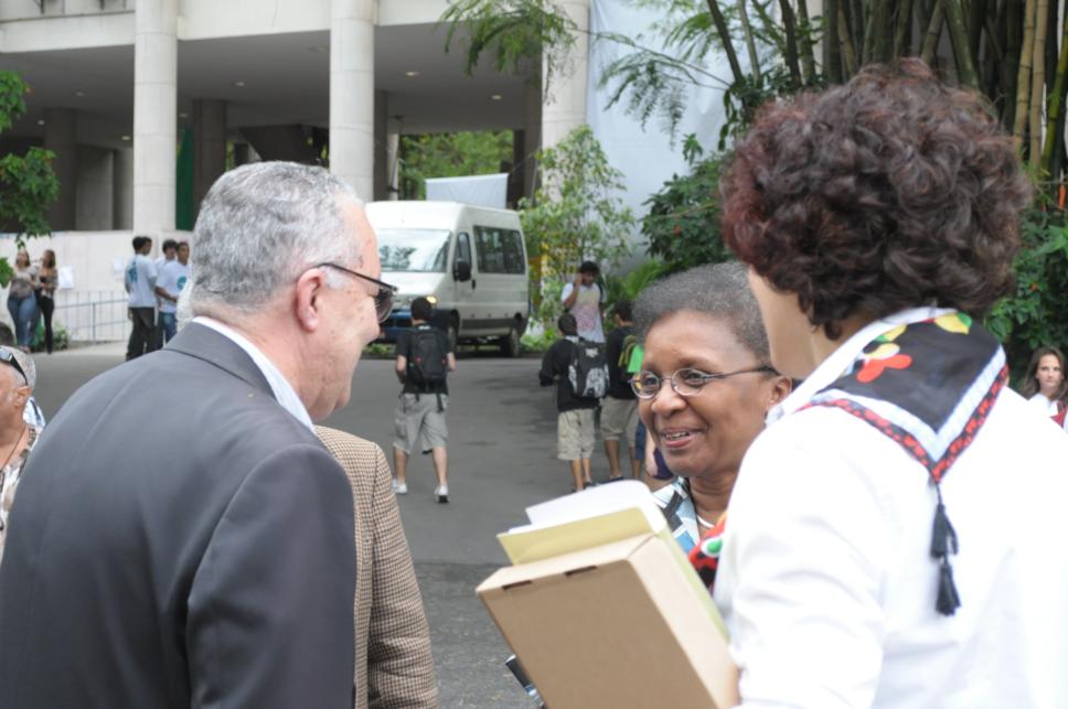 Professor e Reitor Josafá Carlos de Siqueira S.J., Luiza Bairros (Geledés) e Professora Sonia Maria Giacomini conversam durante o evento.