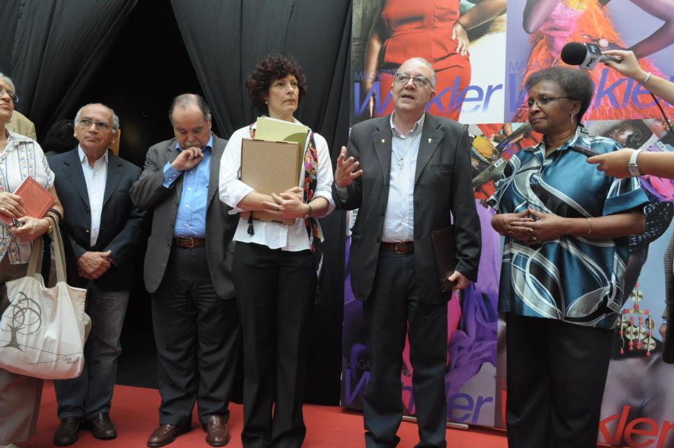 Da esq. para dir.: 1ª prof. Augusto Sampaio (Augusto Luiz Duarte Lopes Sampaio) (COM, Vice-Reitor para Assuntos Comunitários), 2ª prof. Luiz Roberto de Azevedo Cunha (ECO, Decano CCS), 3ª prof. Sonia Maria Giacomini (SOC), 4ª prof. pe. Josafá Carlos de Siqueira S.J. (BIO, Reitor), 5ª Luiza Bairros