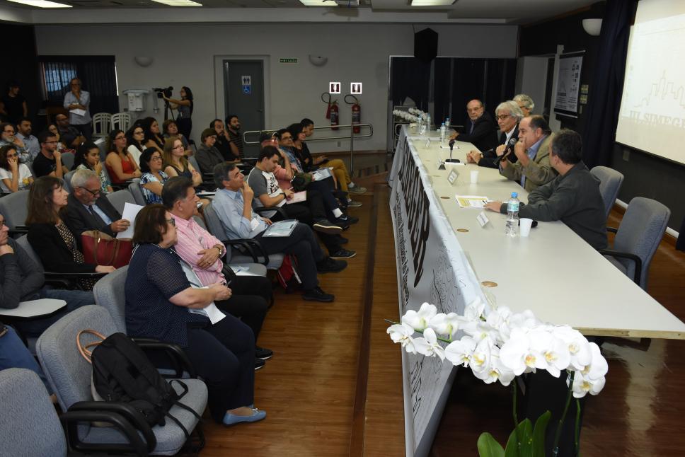 Mesa com convidados e plateia do simpósio.