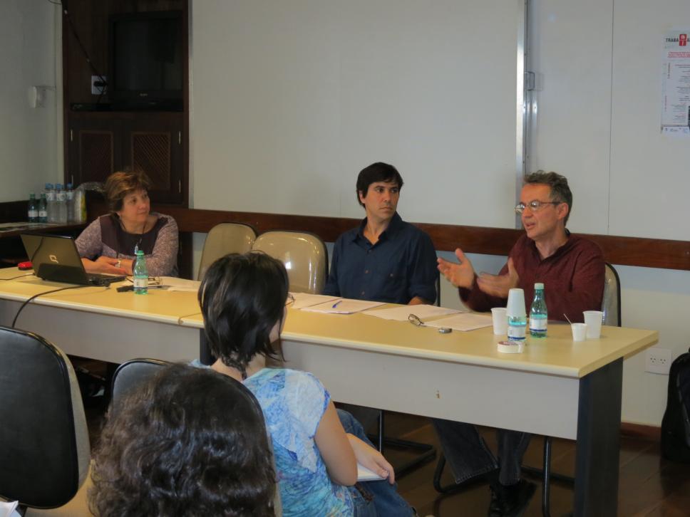 Mesa composta pela profa. Mirta Lobato, pelo mediador prof. Leonardo Pereira e pelo prof. Sidney Chalhoub no workshop da Rede de História Social e Cultural do Trabalho na Argentina e no Brasil.