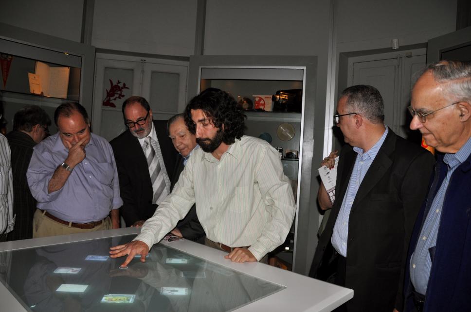 Mesa interativa da Sala Ícones, com fotos relativas aos quatro centros que compõem a PUC-Rio, na Abertura da Exposição PUC-Rio 70 anos, Rumo aos 80.