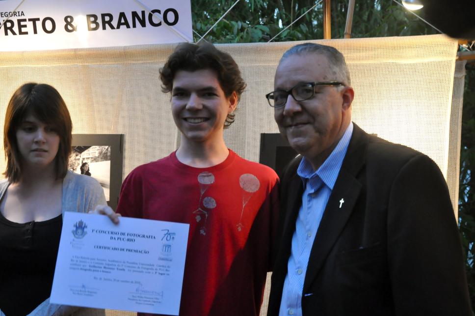O reitor pe. Josafá Carlos de Siqueira, S.J. entrega prêmio a um dos vencedores do Iº Concurso de Fotografia da PUC-Rio, na abertura da Exposição PUC-Rio 70 anos, Rumo aos 80.