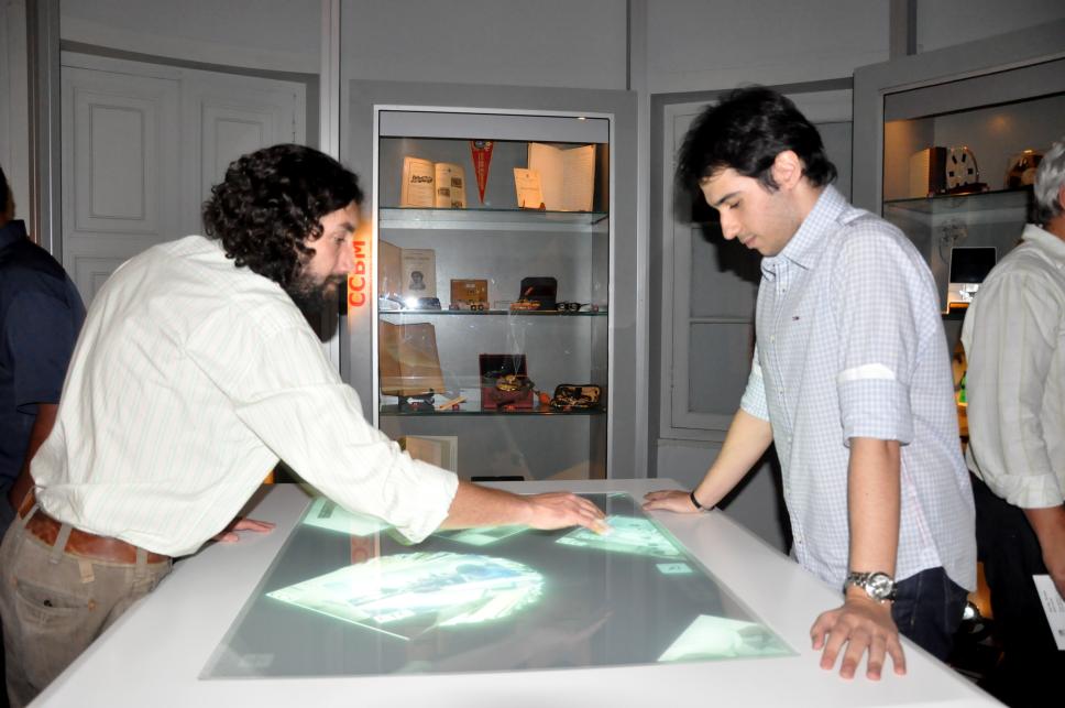 Mesa interativa com fotos relativas aos quatro centros que compõem a PUC-Rio da Sala Ícone na abertura da Exposição PUC-Rio 70 anos, Rumo aos 80.